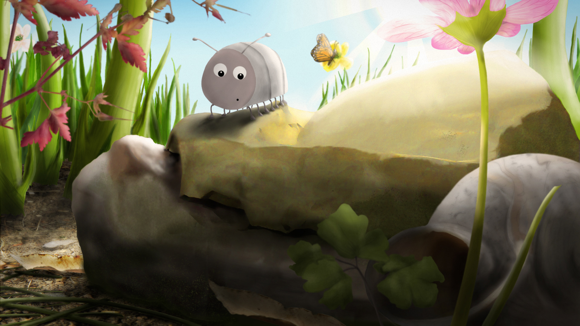 The aesthetic was created through a range of techniques and media, such as paper, stone, cardboard, photographed textures, some 3d elements, photoshop, and then all blended together to create the world of the insects - the brief was to keep as true as possible to the anatomy of the insects, create a sense of realism, whilst appealing to an age range of 4-8yr old children.